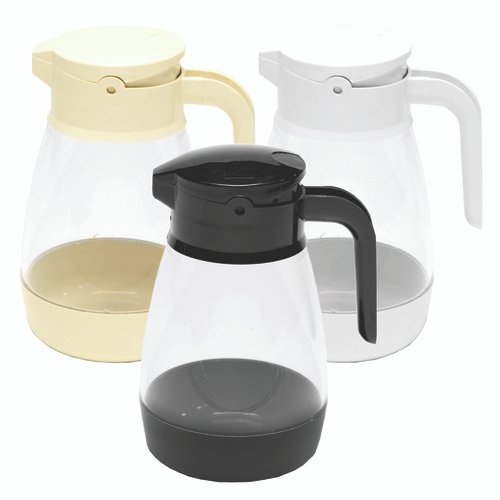 Syrup Saver Syrup/Topping Dispenser, 16 oz., 3” x 4-1/4” x 5-3/4”, dishwasher safe, uninsulated, self-locking lid, dripless, flow-controlled spout, plastic construction, black, Made in USA (Priced per each, packed 6 each per case)